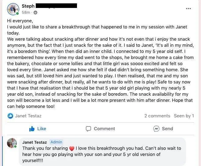 “ I don't struggle with depression or anxiety or self harm any more and feel pretty dam fantastic! I feel so much better. I know the healing journey is an ongoing one but I feel so much confident now I have the right tools"
